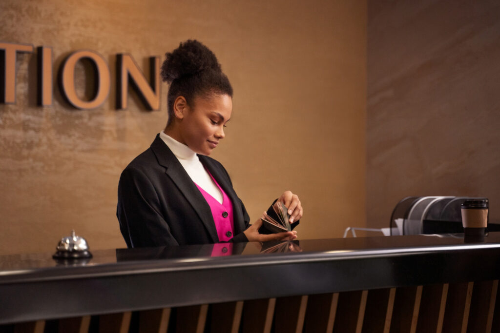 Recepcionistas treinados para oferecer atendimento profissional, organização e a melhor experiência para visitantes e clientes.